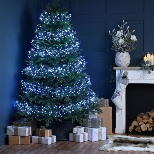 A brighter display beckons with these 1000 Cluster White Christmas Lights. These 1000 crisp white LEDs are spread generously across 12.99m of green cable, delivering a clustered, wintry glow that’s perfect for Christmas trees and outdoor décor. The green cable blends neatly into foliage too! it includes a 10m lead, timer, and smart multi-function settings, that'll make these LED cluster lights both easy to manage and energy-efficient.