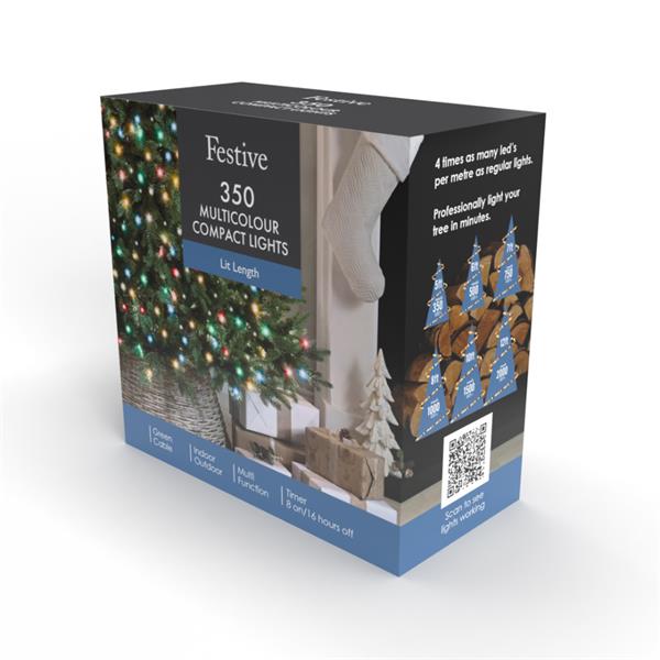 String up some vibrant colourful cheer! Grab a pack of our 350 Compact Multi-Coloured Christmas Lights on Green Cable. 360 compact LEDs in a joyful mix of colours are an easy win if you're all about playful, eye-catching decor. Perfect for trees, garlands, or outdoor displays. The extensiv 24.97 m of lit length and a 5 m lead cable gives you generous leeway for larger decorating projects. It boasts multi-function settings, memory, and a timer, making them energy-efficient, and easy to manage. Bring on the colour this Christmas!