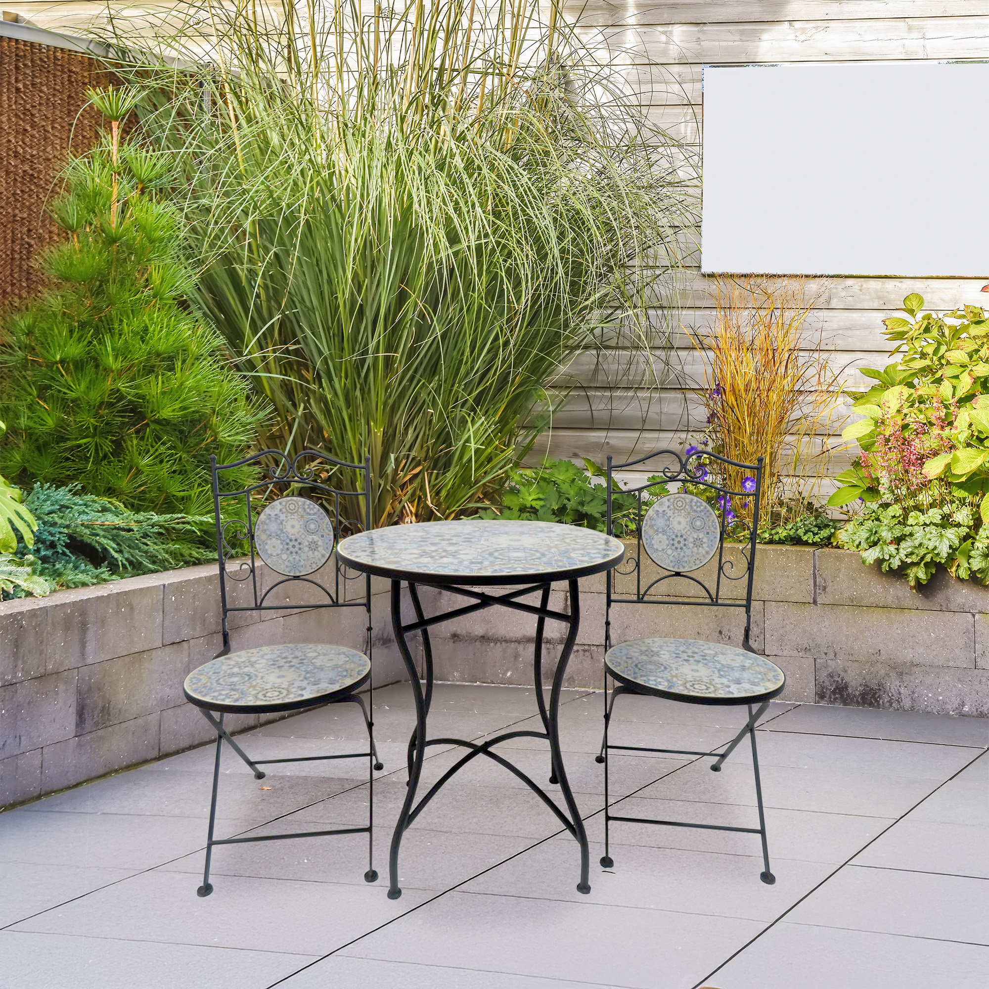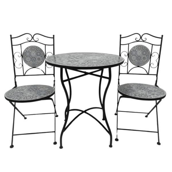 Bring timeless elegance to your outdoor living space with the Avignon Mosaic 2 Piece Bistro Set, a stunning addition to any patio, garden, or balcony. Enjoy a handcrafted mosaic tabletop and chair inlays in an eye-catching blue and taupe colourway. Perfect for those with a refined yet eclectic aesthetic. The sturdy metal frame ensures stability and longevity, while the foldable chairs provide easy storage andportability when not in use. Whether enjoying a morning coffee or evening drinks in the last of the evening sun, this weatherproof bistro set creates the perfect accessory to your alfresco living in even the smallest of outdoor garden spaces.