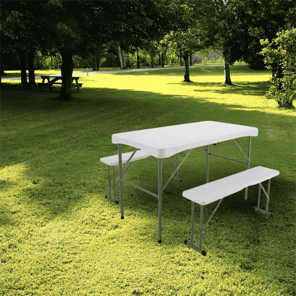 The Folding White Table with 2 Benches is a versatile outdoor/indoor set, perfect for accommodating extra guests during gatherings. The table measures 112x62xH71cm, and each bench is 90x21xH40.5cm, providing ample seating and workspace. Constructed from durable HDPE and a powder-coated finished steel frame, this set is built to last. The table features a 25x1.0mm panel with a thickness of 6.7cm, while the benches have a 19x1mm panel with a thickness of 3cm, ensuring stability and strength. Easy to fold and store, this set is an ideal solution for any occasion.