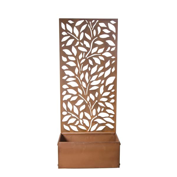 Create a more interesting space in your garden, patio, or balcony with the Planter with Screen 1.1M Leaves Design in Patina, a stylish and functional outdoor feature. Combining a spacious planter base with an intricately designed privacy screen, this decorative metal planter adds a natural aesthetic while offering a subtle partition for outdoor spaces. The patina-finish leaf design blends beautifully with other greenery, making it perfect trellis for climbing plants, flowers, or shrubs. Constructed from durable weather-resistant metal, this elegant planter is designed for long-lasting outdoor use.