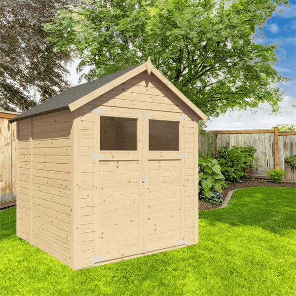 The Shed 6 x 6ft with 2 Windows is a spacious and durable storage solution, perfect for larger gardens or outdoor spaces. Measuring W180xL174cm and providing 3.03m² of storage area, this shed offers plenty of room for gardening tools, equipment, and more. With a maximum ridge height of 225cm, it provides generous headroom. The 12mm MFP-P5 roof thickness and a snow load capacity of 0.85kN/m² ensure it withstands the elements. The complete kit includes roofing felt and floor, and all parts are prefabricated for easy assembly—no sawing or screwing of individual wall panels required. Featuring a 14" round profile tongue and groove design, this shed combines strength and simplicity, while the two windows allow natural light to brighten your space.
