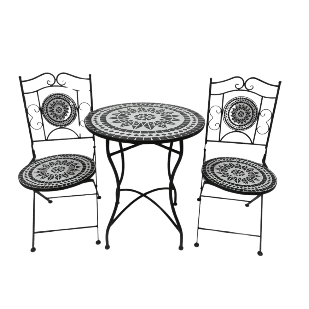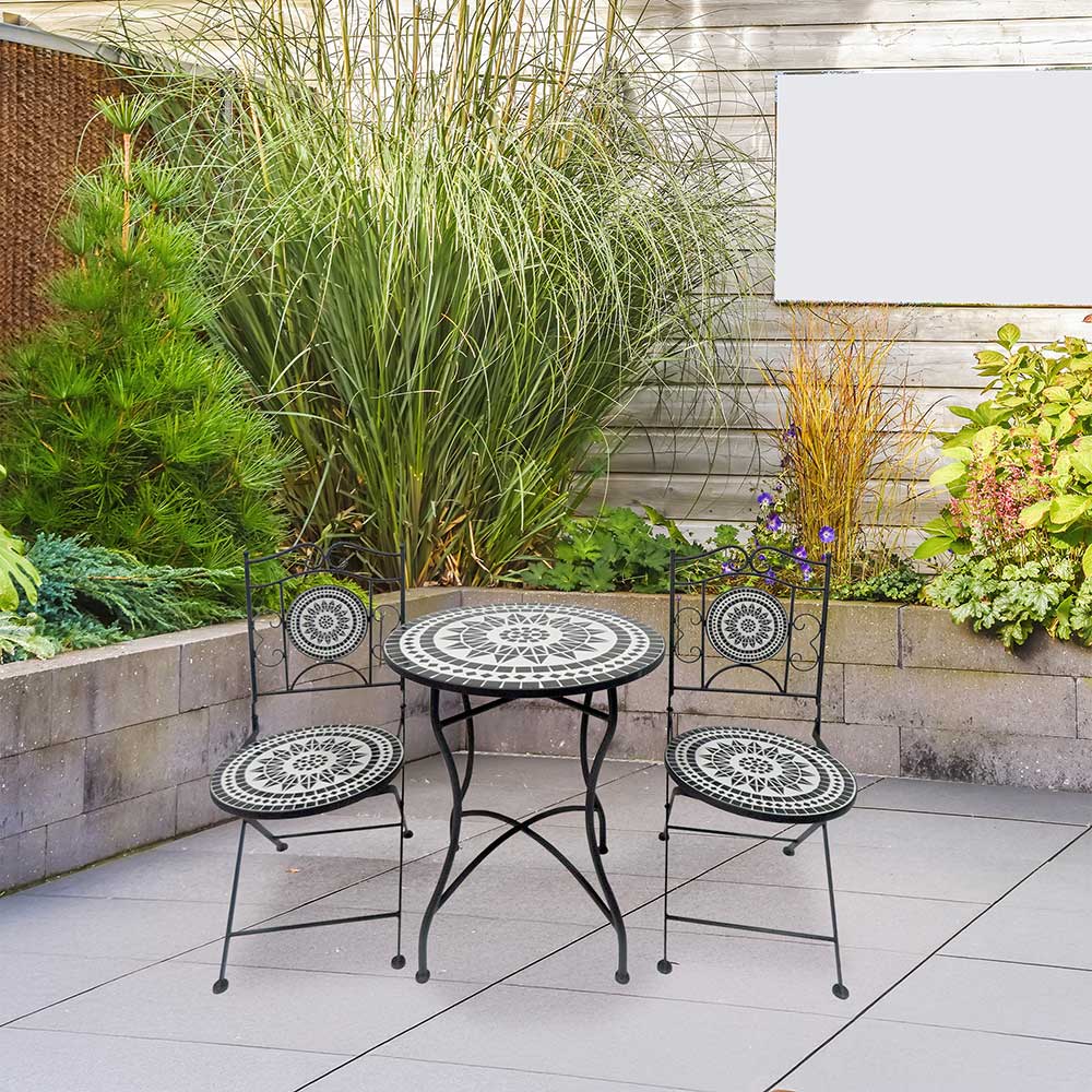 • Compact decorative bistro set for small gardens with elegant black and white mosaic design for a timeless look